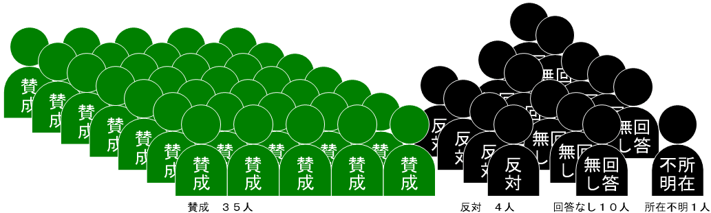 従来であれば 賛成35名 反対4名 回答無し10名 所在不明者1名 賛成35名<反対15名 否決